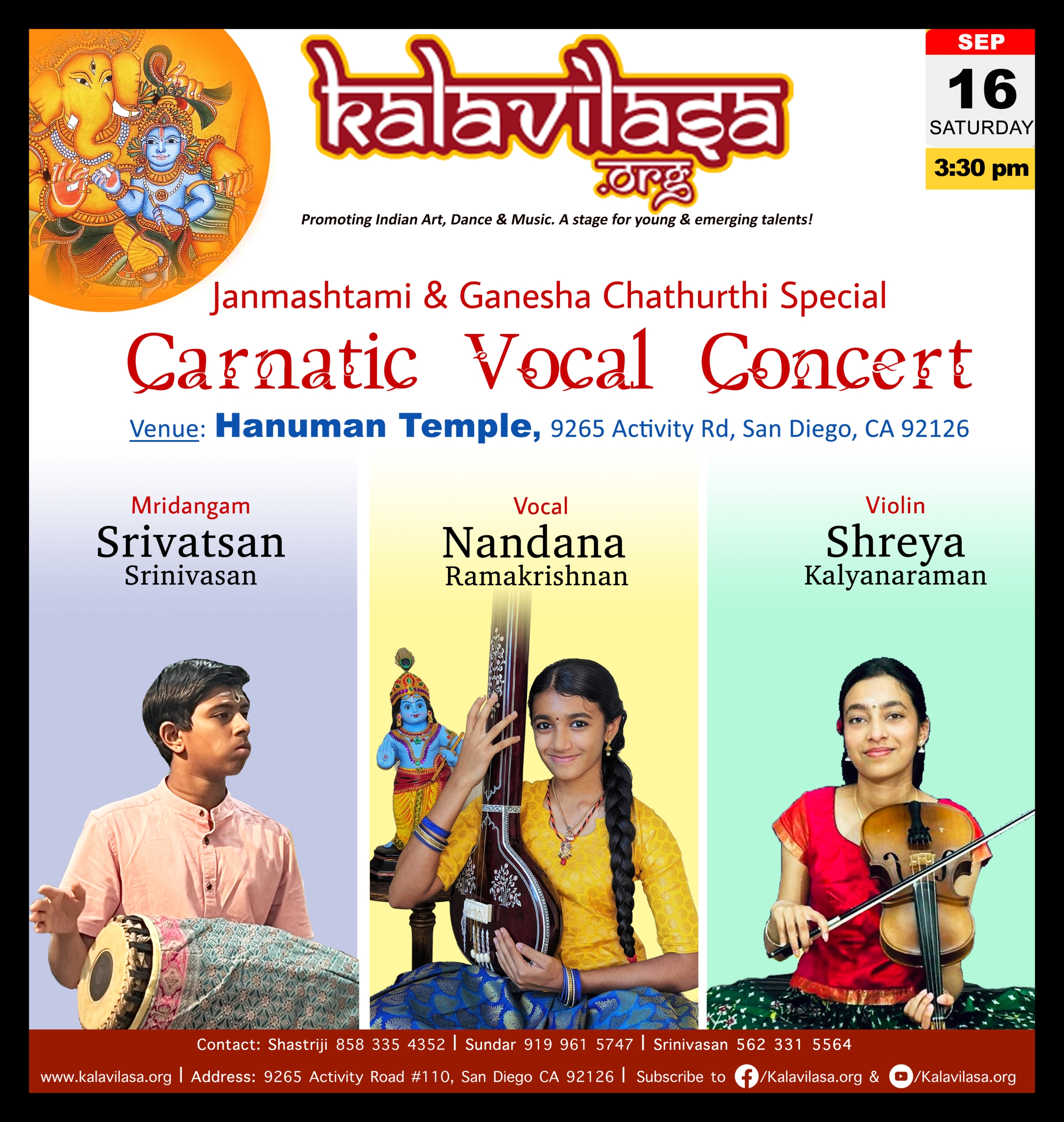 Our temple will be hosting a Carnatic music event on Saturday Sep 16 @3.30pm by young artists Nandana Ramakrishnan, Shreya Kalyanaraman and Srivatsan Srinivasan. This event is organized by Kalavilasa. This event is free and open to all.